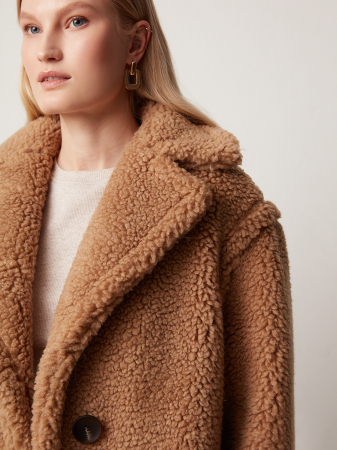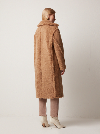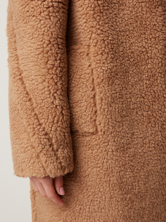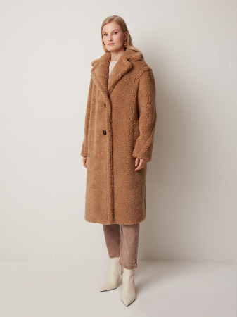 Актуальная экошуба длины миди в оттенке кэмел. Выполнена из плотного искуственного меха с добавлением натуральной овечьей шерсти. Мягкий непродуваемый материал надёжно сохраняет тепло. Модель прямого силуэта, длиной до линии колен, с широким отложным воротником, застёжкой на две пуговицы, спущенной линией плеча, втачным рукавом с рельефом и боковыми прорезными карманамии с листочкой. Экологичная шуба - современная альтернатива меховым изделиям, дополнит как классический образ, так и лук в стиле кэжуал.