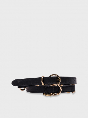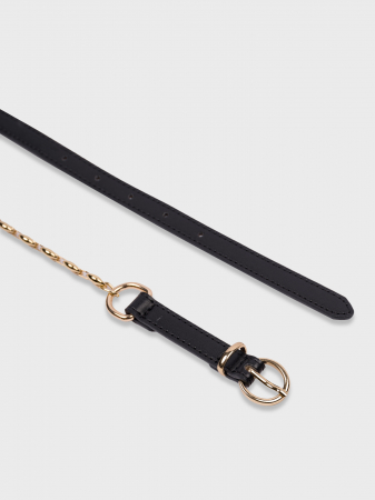 Узкий ремень черного цвета из искусственной кожи, декорированный золотистой металлической цепочкой, станет стильным завершением вашего образа. Ширина ремня 1,5 см