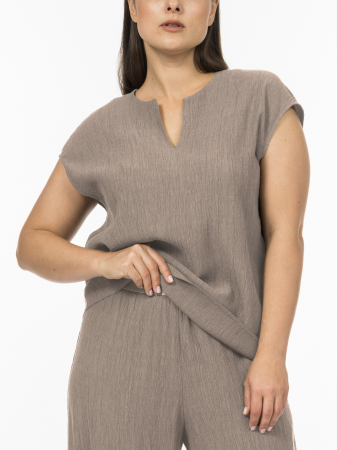 Блуза прямого силуэта со спущенным плечом подчеркивает легкость и непринужденность образа, даря полную свободу движений. Фигурный вырез горловины подчеркивает женственность модели, деликатно обрамляя лицо и делая образ завершенным. Созданная из высококачественной турецкой ткани, блузка сочетает в себе лучшие свойства волокон: воздушную лёгкость и мягкость вискозы, которая дарит коже ощущение свежести даже в тёплые дни, и практичность полиамида, обеспечивающего устойчивость к сминанию, быстрое высыхание и сохранение безупречной формы после носки. Вертикальный крэш-эффект не только добавляет образу визуально интересную текстуру, вытягивая силуэт, но и освобождает Вас от необходимости утюжки. Мягкий серо-бежевый оттенок теплый "тауп", напоминающий природные тона льна и песчаных дюн, идеален для создания самых разных образов и делает блузу универсальной основой гардероба. Такой нейтральный цвет легко комбинируется с любыми оттенками, будь то пастельные тона для нежного образа с брюками TR0568 или насыщенные акценты для смелого лука. Благодаря своему крою и нейтральному цвету, модель станет основой для множества образов и выгодной инвестицией в гардероб.