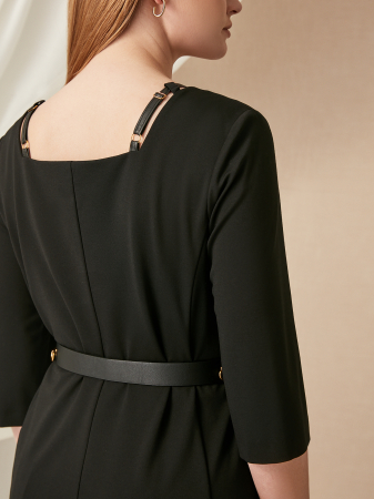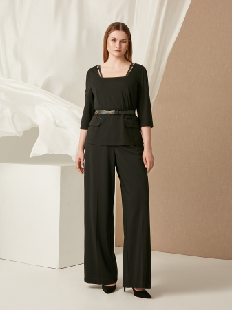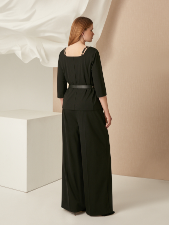 Оригинальная блуза из плотного трикотажа сдержанного чёрного цвета. Модель полуприлегающего силуэта, с рукавом 3/4 и карманами-имитациями с клапанами, декорированными тесьмой из эко кожи. Завершают дизайн квадратные вырезы спереди и сзади с изящными декоративными бретелями. Блузу можно дополнить кожаным ремнём-акцентом на талии. Легко сочетать с широкими трендовыми брюками из той же костюмной группы.