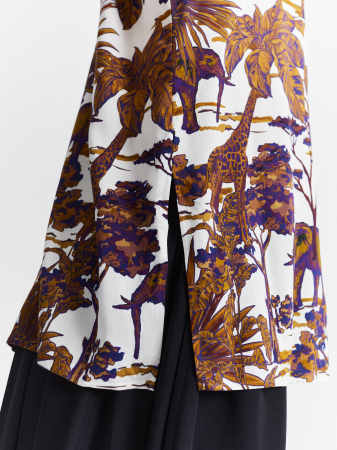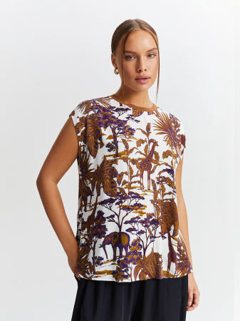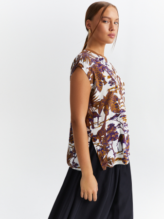 Легкая блуза из 100% вискозного полотна станет акцентной вещью летнего гардероба. Легкий дышащий материал хорошо пропускает воздух и за счет своей мягкости дарит ощущение комфорта в течение всего дня. Удобная укороченная длина рукава не сковывает движений, а природный принт в мягких теплых оттенках скроет недостатки и подчеркнет достоинства фигуры, притягивая к себе внимание. Блуза отлично сочетается с однотонными брюками, юбками или джинсами, что делает ее идеальным выбором для повседневных образов.
