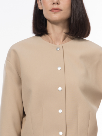 Бомбер — это практичная и актуальная куртка, сочетание ретро-эстетики с современным уличным стилем. Мягкие и эластичные подвязы, выполненные на собственной фабрике из качественной пряжи на основе нежной вискозы, обрамляют низ спинки и круглый вырез, добавляя образу утонченности и подчеркивая ретро-шарм. Каждая деталь бомбера продумана до мелочей: плотная поливискозная ткань саржевого переплетения придает куртке износостойкость и особую текстуру, а подкладка из вискозы и полиэстера обеспечивает легкость, мягкость, дышащие свойства и прекрасную посадку. Спандекс в составе ткани добавляет эластичность, делая бомбер удобным и комфортным в носке, а также формоустойчивым. Песочно-бежевый оттенок Сафари, нейтральный и универсальный, сочетается с любыми оттенками, делая бомбер идеальным участником самых разных образов. О-силуэт, созданный благодаря подвязу по низу спинки и четырем вертикальным вытачкам, придает куртке объемный, но при этом актуальный вид, подчеркивая современный крой и обеспечивая комфорт. Спущенное плечо и втачной рукав хорошей ширины добавляют образу комфорта, расслабленности и свободы движений, а стильные серебристые кнопки завершают образ, добавляя современный акцент и являясь надежной застежкой. Этот бомбер подчеркнет Ваш хороший вкус и обеспечит ощущение уюта.