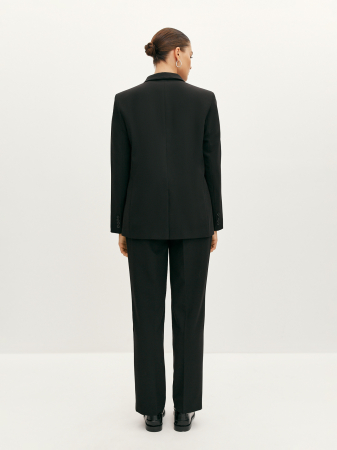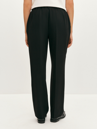 Классические брюки со стрелками чёрного цвета. Выполнены из плотной костюмной ткани с добавлением вискозы. Этот высококачественный материал прост в уходе и надолго сохраняет первозданный внешний вид. Модель прямого силуэта с притачным поясом со шлёвками под ремень и косыми карманами. Моделирующие вытачки сзади и резинка на поясе обеспечивают комфортную посадку по фигуре.