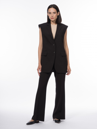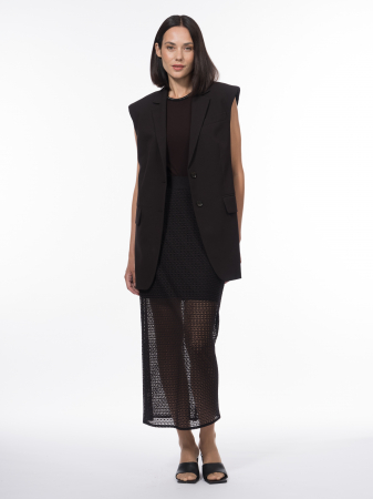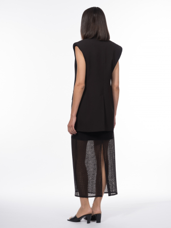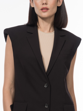 Выполнили жилет по силуэту и деталям похожим на мужской пиджак, что сделало его невероятно актуальным и вывело костюм в уверенном черном на новый уровень. Акцент на плечах и клапаны функциональных карманов, вкупе с полуприлегающим силуэтом, визуально формируют "песочные часы". Глубокий V-вырез, оформленный с помощью английского воротника, а также дизайнерский срез борта придают необходимое вертикальное направление модели. Часовой карман с листочкой и шлица - в поддержку мужского стиля. Общий крой жилета позволяет носить его без рубашки и использовать в вечерних образах, дополняя брюками из такой же ткани или экспериментируя с цветом и фактурами. Высокотехнологичная вискозная ткань отлично подходит для костюмной группы, она тактильно приятна, хорошо пропускает воздух и устойчива к износу, а стильный черный уместен в любой ситуации и притягивает взгляды.