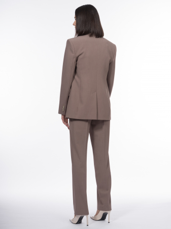 Создали жакет однобортным, с акцентными плечами и классическим английским воротником. Модель дополнена прорезными карманами с клапанами, нагрудным карманом с листочкой, декоративными карманами на рукавах и функциональной шлицей по центральному шву спинки. Такие детали характерны скорее для мужского пиджака, что вместе с полуприлегающим силуэтом только подчеркивает женственность. Благодаря возможности дополнить пиджак жилетом и брюками, женственный силуэт в мужской комплектации выводит эстетику костюма на новый уровень. Высокотехнологичная вискозная ткань отлично подходит для костюмной группы, она тактильно приятна, хорошо пропускает воздух и устойчива к износу, а благородный светло-коричневый меланжевый оттенок, актуальный как никогда, универсален в сочетаниях и делает костюм основой для рационального гардероба.