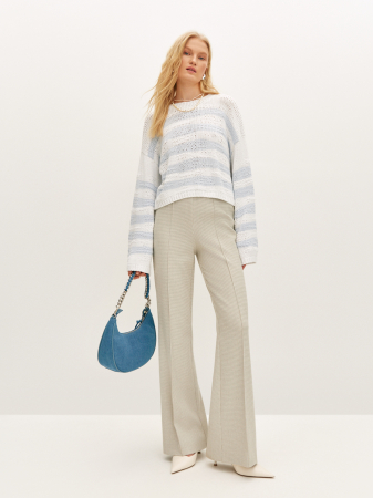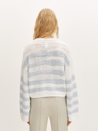 Джемпер фактурной вязки в асимметричную полоску бело-голубого оттенка получился максимально комфортным за счет прямого силуэта и среднего объема. Изделие со спущенной линией плеча и длинным рукавом выполнили из мягкой итальянской пряжи. Наши стилисты предлагают создать образ с брюками, который подойдет как для офиса, так и для повседневной носки.