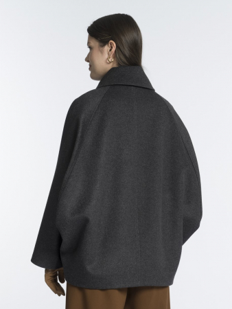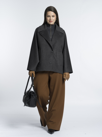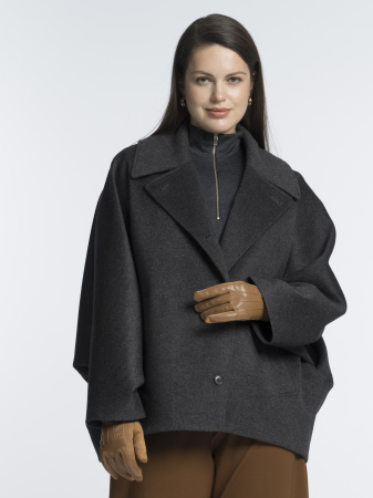 Однобортное укороченное теплое пальто сезона Осень из шерстяной ткани на поливискозной подкладке силуэта oversize подходит также для весны и мягкой зимы. Шерсть сохранит тепло тела и согреет в холодную погоду. Силуэт оверсайз предполагает ношение вещей большого размера, это удобно и стильно. Пальто не приталенное, но отлично сочетается по пропорциям с силуэтными моделями длины до колена, а также миди и макси. Модель выполнена с удлиненной спинкой и заужением книзу. Стильное пальто с английским воротником и цельнокроеным рукавом "летучая мышь" напоминает оригинальную куртку, уместно в деловом и кэжуал стиле и подходит для офиса и прогулок. Темно-серый меланж делает модель участником образов любой степени яркости. Меланжевые ткани всегда имеют базовый цвет, к которому подбираются нити оттенков, близких к основному. Выбирая модели из таких тканей, Вы поддерживаете тренд экологической устойчивости, ведь при их производстве используется меньше воды и энергии, чем при традиционных методах окрашивания.