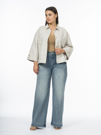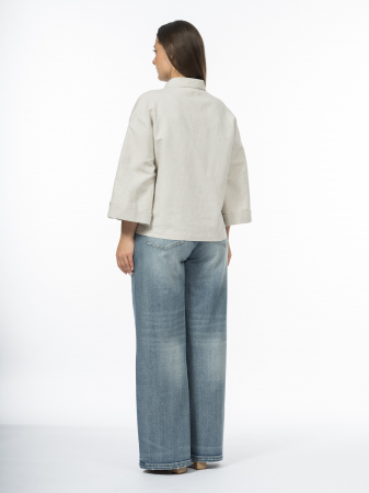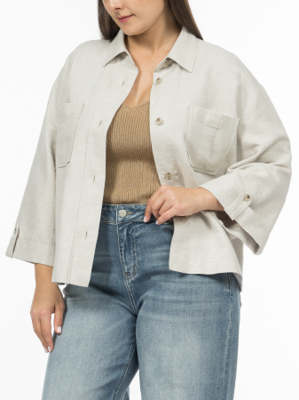 Легкая куртка прямого кроя невероятно удобна. Ткань из натуральных волокон льна и хлопка поддерживает комфортную температуру. Лен — это экологически чистый материал, который обеспечивает высокий уровень комфорта и безопасности для кожи. Он хорошо пропускает воздух и обладает терморегуляцией, как раз поддерживая комфортную температуру тела в жаркую погоду. Лен впитывает влагу и быстро испаряет её, обеспечивая ощущение сухости и комфорта даже в условиях высокой влажности. Его износостойкость и антибактериальные свойства делают куртку практичной и гигиеничной. Хлопок добавляет мягкость и комфорт, делая рубашку приятной для носки. Прямой крой и укороченный рукав не сковывают движения. Оригинальны петли на патах, образованные закрепками на полосках ткани, а также накладные карманы с заутюженной складкой. Небольшой отложной воротник на отрезной стойке дисциплинирует модель и позволяет адаптировать жакет, помимо прочего, в классические образы. Натуральный светло-бежевый оттенок куртки универсален и легко сочетается с другими элементами гардероба, делая модель идеальной базой для создания различных образов.