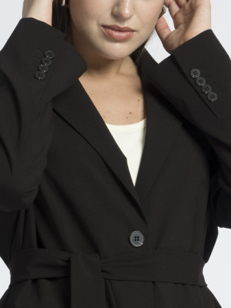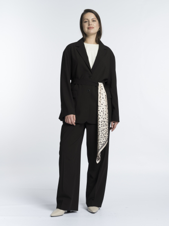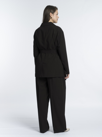 Черный однобортный пиджак с английским воротником – воплощение современной элегантности, он создан для тех, кто ценит безупречный крой и универсальность в деталях. Глубокий, насыщенный черный цвет, благородный и строгий, делает эту модель идеальной основой как для делового гардероба, так и для вечерних образов, легко сочетаясь с классическими брюками, джинсами и легкими платьями. Мягкое неформованное плечо и втачной двухшовный рукав со спущенной линией создают непринужденный, слегка расслабленный силуэт, который выглядит одновременно стильно и комфортно – идеальный баланс между офисной строгостью и повседневной легкостью. Декоративная шлица с пуговицами по низу рукава добавляет пиджаку изысканный акцент, подчеркивая внимание к деталям, а подкройной бочок обеспечивает идеальную посадку по фигуре, мягко облегая, но не сковывая движений. Практичные боковые карманы с клапанами не только дополняют образ, но и предоставляют удобное место для хранения мелочей, в то время как пояс из основной ткани с незаметными шлевками позволяет при желании подчеркнуть линию талии, добавляя женственности силуэту. Задняя шлица обеспечивает свободу движения, делая жакет удобным для повседневной носки. Костюмная ткань из нежной вискозы, согревающей шерсти, прочного полиэстера и формоустойчивого спандекса создает оптимальное сочетание прочности, мягкости и эластичности: пиджак прекрасно держит форму, практически не мнется и при этом остается приятным к телу, а подкладка из высокотехнологичного полиэстера обеспечивает комфортное скольжение по одежде. Такой пиджак - выгодная инвестиция в гардероб: он подойдет для важных встреч, коктейльных вечеров, свиданий или просто прогулок по городу, добавляя образу утонченности и уверенности, особенно в сочетании с брюками TR0598.