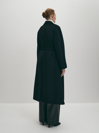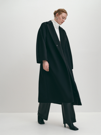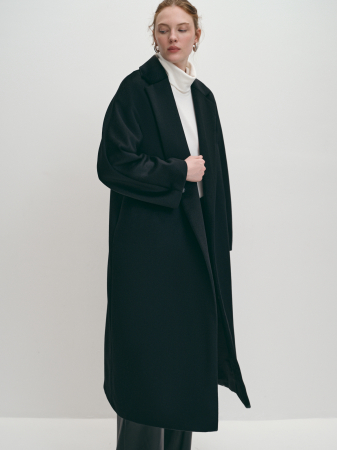Пальто сезона Осень из овечьей шерсти на поливискозной подкладке отлично подходит для осени и мягкой зимы. Это модная модель прямого силуэта с английским воротником и цельнокроеным рукавом. Приталенное, благодаря поясу, пальто придаёт изящество и женственность. Модель прекрасно гармонирует с платьем и юбками разной длины, классическими брюками, джинсами. Карманы в боковых швах не перегружают образ, а высокая шлица обеспечивает комфортный шаг. Модная модель пальто-халат является базовой, уместна в деловом, casual (кэжуал) и спортивном стиле, подходит для офиса и для прогулок. Пальто выполнено в размерной линейке бренда Lalis, это модель, прекрасно подходящая для больших размеров. Если подобрать размер на один-два больше обычного, можно формировать модный силуэт oversize (оверсайз). Стильный черный вытягивает силуэт и универсален в сочетаниях.
