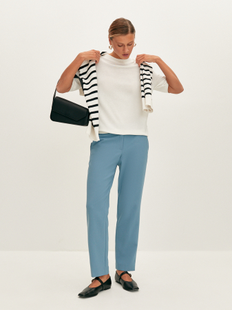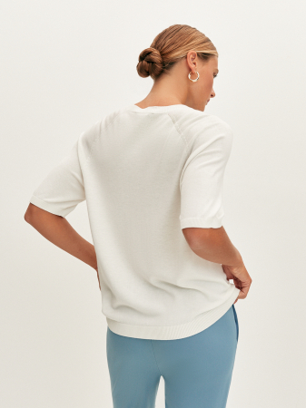 При создании цельновязанной футболки с коротким рукавом реглан и круглой горловиной использовали итальянскую вискозную пряжу, которая по своим свойствам отлично пропускает воздух. Прямой силуэт и средний объем модели обеспечит комфортную, не сковывающую движения посадку. Изделие дополнит образ в стиле смарт – кэжуал.