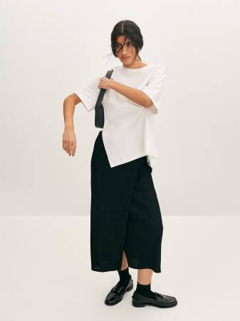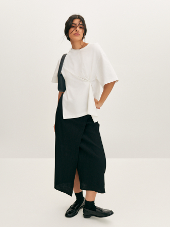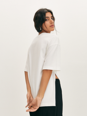 Базовая футболка в свежем прочтении с эффектным дизайном. Плотная ткань из хлопкового трикотажа с небольшим содержанием эластана, позволяет изделию держать форму, но при этом мягко струится по фигуре. Модель прямого кроя, со спущенной линией плеча и свободным втачным рукавом. Акцентной деталью служит изящный защип на талии и разрез, создающий ассиметричный эффект. Футболка станет идеальной основой образа с юбкой-миди и широкими брюками.