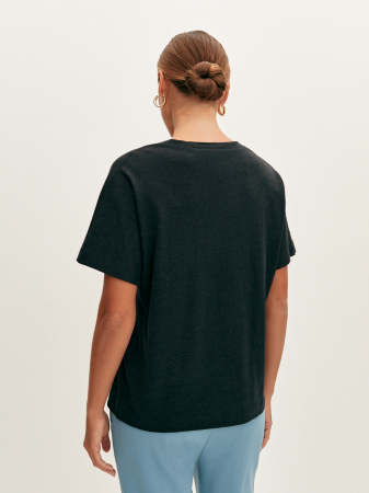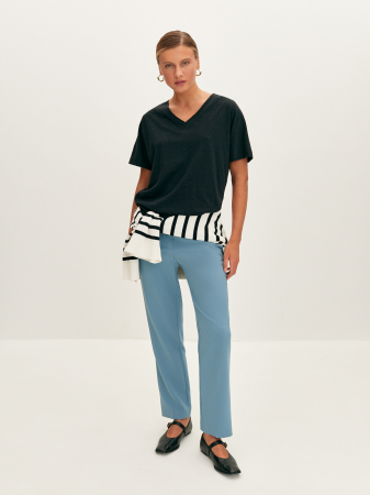 Базовая футболка с V-образным вырезом в лаконичном белом и черном цвете с вкраплениями «nope». Выполнена из тонкого трикотажа на основе конопляного волокна, экологически чистого и безопасного для кожи. Практически не ощущается на теле, а свободный фасон обеспечивает идеальную посадку на любой тип фигуры. Модель прямого силуэта с цельнокроеными рукавами. Основа для повседневного гардероба, сочетается с классическими брюками и джинсами.