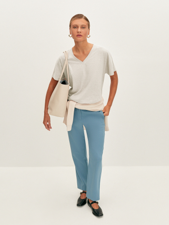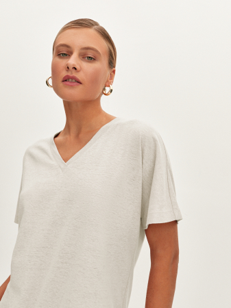 Базовая футболка с V-образным вырезом в лаконичном белом и черном цвете с вкраплениями «nope». Выполнена из тонкого трикотажа на основе конопляного волокна, экологически чистого и безопасного для кожи. Практически не ощущается на теле, а свободный фасон обеспечивает идеальную посадку на любой тип фигуры. Модель прямого силуэта с цельнокроеными рукавами. Основа для повседневного гардероба, сочетается с классическими брюками и джинсами.