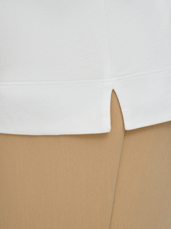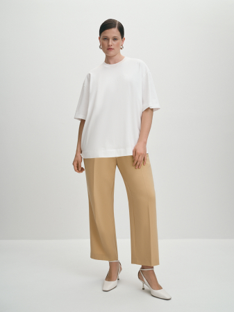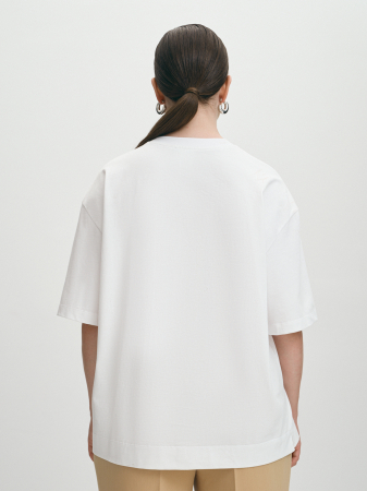 Футболка в базовом белом силуэта оверсайз. Oversize предполагает ношение вещей большого размера, это удобно и стильно. На изделии брендированная вышивка в тон, выполненная пайетками на специальном оборудовании фирмы TAJIMA. Максимальный комфорт обеспечивают спущенная линия плеча, круглая горловина и свободный крой, а также мягкий и приятный к телу мерсеризованный 100% хлопок. Актуальная длина изделия позволяет носить футболку как навыпуск, так и в заправленном виде, благодаря чему она идеально впишется в повседневный гардероб. Футболка будет прекрасным дополнением к джинсам и брюкам из коллекции, а также под пиджак.