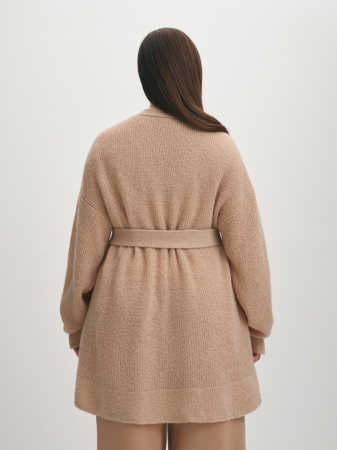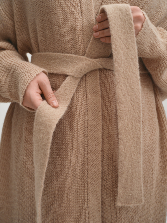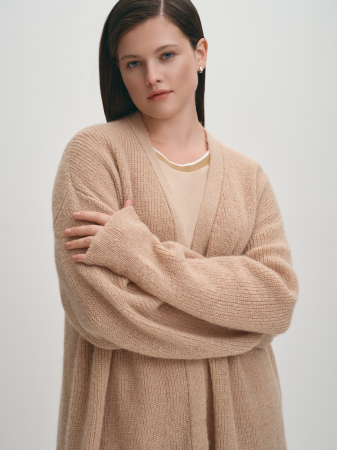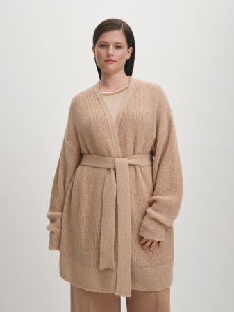 Стильный пушистый кардиган силуэта oversize из воздушного мохера и овечьей шерсти. Модель выполнена на японской плосковязальной машине Shima Seiki. Кардиган без застежки, с возможностью фиксации на талии поясом из аналогичной пряжи. Силуэт оверсайз достигнут с помощью спущенного плеча и свободной формы модели, он предполагает ношение вещей большого размера, это удобно и стильно. Кардиган отлично сочетается по пропорциям с прямыми или приталенными моделями длины миди или макси. Базовый, спокойный бежевый кардиган воплощает традиции модного стиля old money.