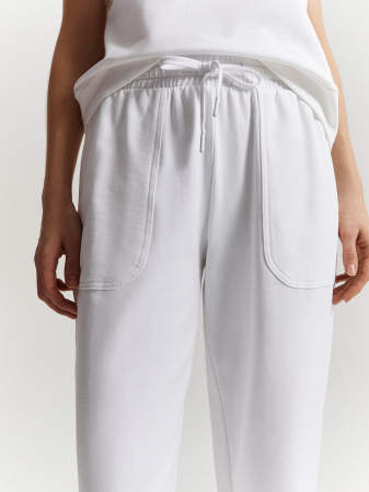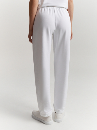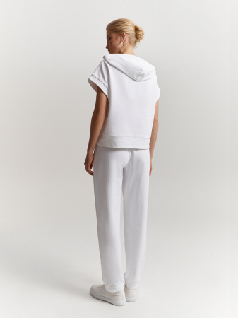 Однотонные спортивные джоггеры белого цвета выполнены из мягкого хлопкового трикотажа, который слегка тянется и не сковывает движений. Модель прямого силуэта с комфортным эластичным поясом и крупными накладными карманами спереди. Свободный крой обеспечивает удобную посадку на любой тип фигуры. Низ изделия оформлен резинкой и декорирован разрезами с тесьмой-молнией, что позволяет изменять ширину брюк для большего комфорта и удобства. В сочетании с футболками из коллекции создадут расслабленные образы на каждый день.