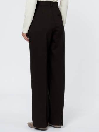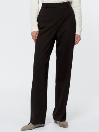 Брюки прямого кроя — универсальная модель для повседневной носки. Слегка зауженные, со стрелками, они создают аккуратный силуэт, а притачной пояс со шлевками обеспечивает удобную посадку. Выбрали для лаконичных брюк очень темный, почти черный оттенок и добавили сзади декоративный карман с листочкой для стильного акцента.