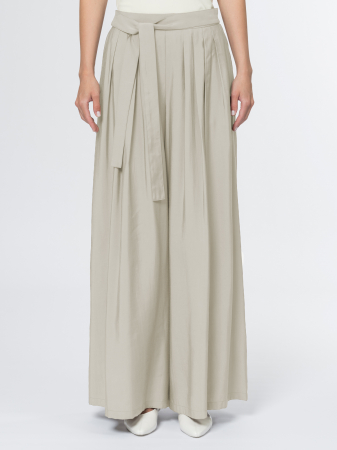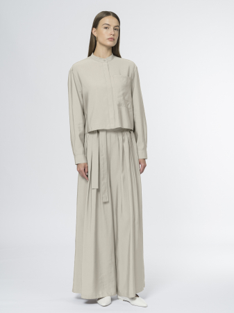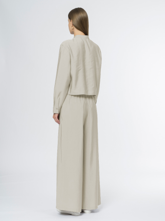 Широкий крой со встречными складками создает грациозный силуэт, визуально удлиняя ноги. Притачной пояс с резинкой по спинке обеспечивает удобную посадку. Нежный лунный серо-бежевый оттенок легко сочетается с разными вещами.