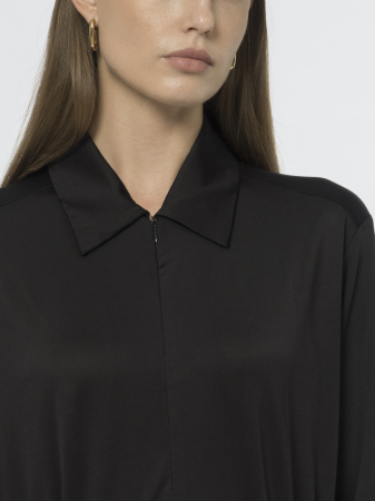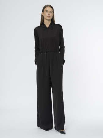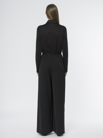 Модель с отложным воротником и длинными рукавами выглядит элегантно. Удобная застёжка на потайную молнию спереди делает комбинезон практичным в носке. Верхняя часть слегка присборена по линии отреза, создавая женственный силуэт, а свободные широкие брючины со шлёвками добавляют образу лёгкости.