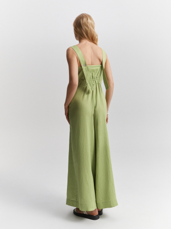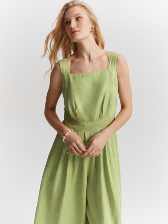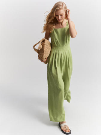 Длинный льняной комбинезон пастельного фисташкового оттенка. Натуральная ткань премиального качества с деликатным матовым блеском дышащая и комфортная, приятная к телу. Приталенная модель без рукавов, на широких бретелях. Крупные складки у пояса подчеркивают силуэт. Можно носить как самостоятельно, так и накинуть сверху льняной блейзер или рубашку. Образ дополнят изящные открытые босоножки, мюли или слипоны.