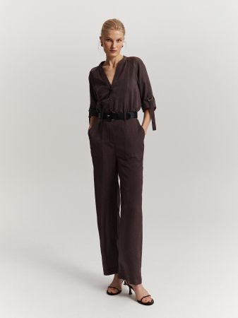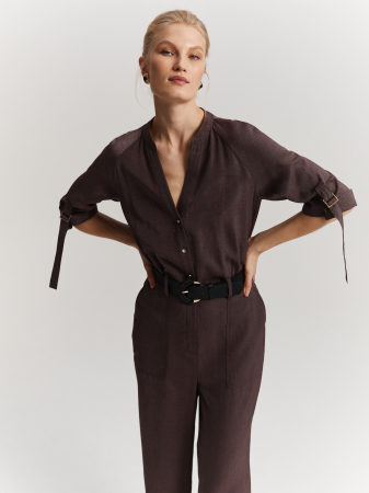 Трендовый комбинезон в сложном коричневом цвете с деликатным мерцающим блеском напоминает комплект из рубашки с V-образным вырезом и прямых брюк со съемным ремнем. Модель с накладными карманами выполнена на основе мягкой вискозы и обладает отличной терморегуляцией и воздухопроницаемостью. Широкий ремень по линии талии подчеркивает фигуру и формирует женственный силуэт, добавляя образу женственность и элегантность.
