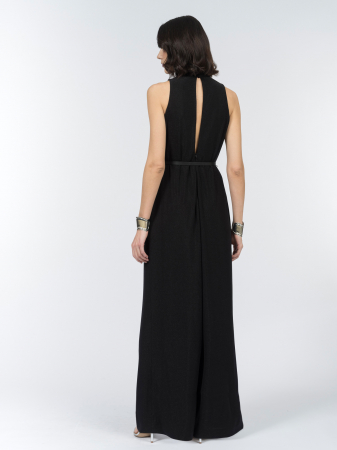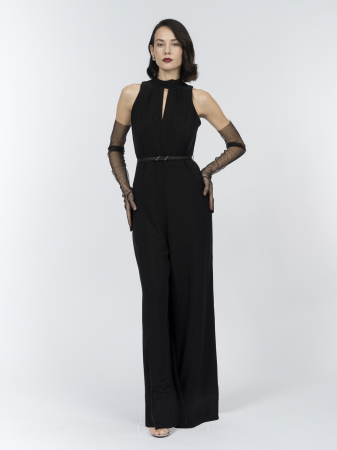Воротник-стойка, американская пройма и изящные вырезы "замочная скважина" подчёркивают достоинства фигуры, а широкие брючины добавляют динамики.