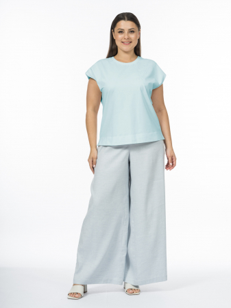 Футболка выполнена в стиле «кэжуал», но не лишена романтики. Выбрали для модели со сложным декором эластичный хлопковый трикотаж. Хлопок в составе такого полотна гипоаллергенен, хорошо дышит, удобен в эксплуатации и не требует дополнительного ухода. Спандекс добавляет натуральным волокнам формоустойчивость и эластичность. Футболка без рукавов со слегка спущенным плечом зайдет в гардероб как соло и как первый слой. Модель прямого силуэта дополнена небольшими разрезами по бокам, обеспечивающими прекрасную посадку по бедрам. Аккуратный круглый вырез создает сбалансированный силуэт, подчеркивая зону декольте, по горловине выполнена обтачка из хлопкового трикотажа рибана в тон основной ткани. Привлекает внимание вышивка с пайетками в комбинации с принтом, нанесенные на собственном производстве полного цикла. Многослойный и многогранный, декор сочетает в себе различные техники и материалы для создания уникального визуального эффекта. Принт формирует основу изображения, задавая цветовую гамму и общие контуры рисунка. Вышивка добавляет текстуру и рельефность, подчеркивая детали и создавая ощущение реалистичности. Пайетки придают декору блеск и динамику, усиливая 3D-эффект за счет игры света и тени. Акцент здесь сделан на сложной, детализированной работе и визуальной выразительности. Ветка с цветами в таком исполнении выглядит живой и объемной, что делает футболку ярким и запоминающимся предметом гардероба. Нежный голубой оттенок - отличная база для дизайнерского декора.