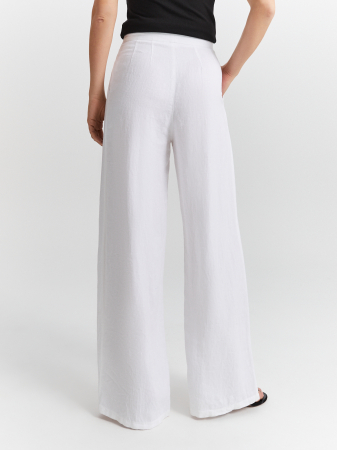 Трендовые широкие брюки чистого белого цвета. Натуральный невесомый лён легко пропускает воздух, поддерживает оптимальную температуру и обеспечивает максимальный комфорт. Свободный крой и расклешение от бедра обеспечивают удобную посадку на любой тип фигуры. Брюки дополнены притачным поясом и французскими карманами. Для создания однотонного летнего образа брюки можно дополнить жакетом из того же материала.