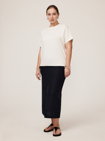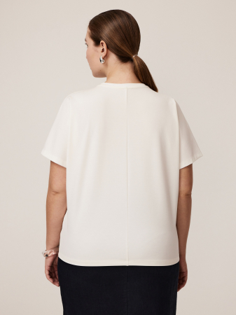 Футболка из тонкого трикотажа на основе вискозы в базовом белом. Модель средней длины, с цельнокроеным рукавом и круглым вырезом с отделкой трикотажем «рибана». По низу изделие дополнено брендированной вышивкой, выполненной на специальном оборудовании фирмы TAJIMA.