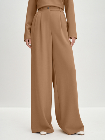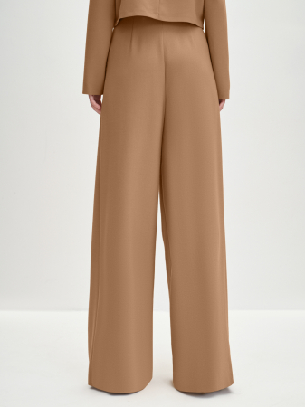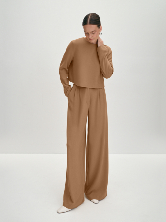 Брюки палаццо с традиционной застежкой-гульфиком на молнию и пуговицу. Разнонаправленные складки от притачного пояса добавляют необходимую для такой модели ширину брючин. Брюки дополнены классическими косыми боковыми карманами. Выбрали для модели универсальную костюмную ткань - вискоза в составе отвечает за тактильный комфорт. Модель идеально сочетается с укороченной лаконичной блузой из такой же ткани. Костюм в табачно-коричневом относит нас к стилю old money, он будет уместен на любом мероприятии и будет востребован как нарядный, вечерний, новогодний, офисный, повседневный, школьный.