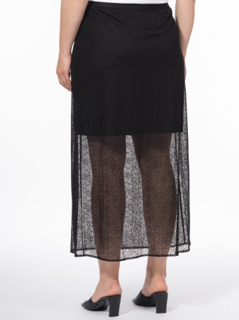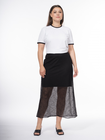 Юбка отличается слегка расклешенным кроем и разностью длин основной ткани и подкладки. Полная длина модели - миди, а благодаря укороченной подкладке актуальный тренд сезона - прозрачность - заявляет о себе. Юбка выполнена из мягкой нейлоновой кружевной сетки, комплементарной к коже тела. Ажурное полотно турецкого производства тонкое, но прочное, благодаря полиамиду, который продлевает срок службы и эластану, призванному сохранять форму изделия. Дополнительный комфорт обеспечивает тактильно приятная вискозная подкладочная ткань. Кружевные модели вышли за пределы вечерних образов и являются полноправными участниками если не базового, то повседневного гардероба. Выбор наших стилистов - эффектное сочетание стильной черной юбки с белой базовой футболкой TS0100K - образ, который подойдет для неформальных мероприятий.