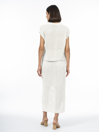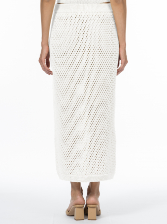 Изделия из натуральной российской пряжи – это воплощение нежной эстетики и безупречного комфорта в сочетании с заботой о каждой детали. Юбка длины миди прямого силуэта прекрасно дополняет блузу с коротким рукавом из такой же пряжи. Пояс присоединен на особом кеттельном оборудовании, боковые швы соединены аналогичным способом – это гарантирует идеальную посадку и долговечность, ведь кеттельный шов особенно эластичен и не способствует излишнему стягиванию нитей. Мягкий хлопок, воздушный и дышащий, создает ощущение невесомости и помогает чувствовать себя лучше в жару. Подкладка из 100% вискозы дарует дополнительный комфорт. Искристые пайетки, вплетенные в вязаное полотно, добавляют образу ненавязчивый шарм, переливаясь при каждом движении. Ярко-белый цвет – базовый оттенок. Он отражает солнечный свет и является идеальным фоном для летних образов. Такой оттенок не просто освежает – он придает коже сияние и освежает летний загар. Стиль модели – гармония расслабленного кэжуала и романтичной женственности. Ажурный узор придает воздушность, а пайетки расставляют деликатные акценты, превращая повседневный образ в нечто особенное. Костюм из юбки в сочетании с блузой такой же вязки для тех, кто ценит универсальность особого уровня.