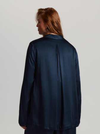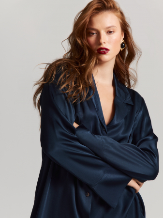 Таинственный синий цвет и благородная фактура ткани делают блузу универсальной. Готовый образ получится в сочетании с топом TP0114 и брюками TR0660.