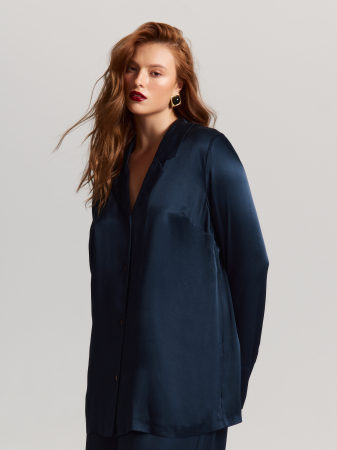Блуза в пижамном стиле - вне трендов, а потому инвестиционная вещь. Сшитая из вискозной ткани с атласным блеском, она хорошо дышит, приятна на ощупь и красиво переливается на свету.
