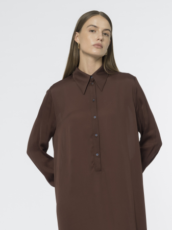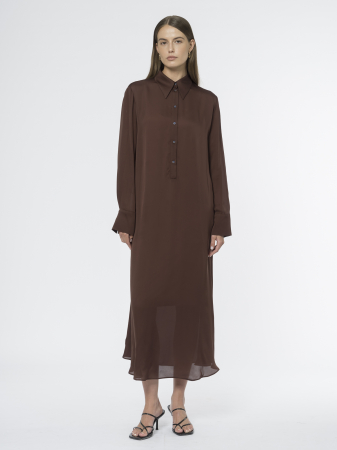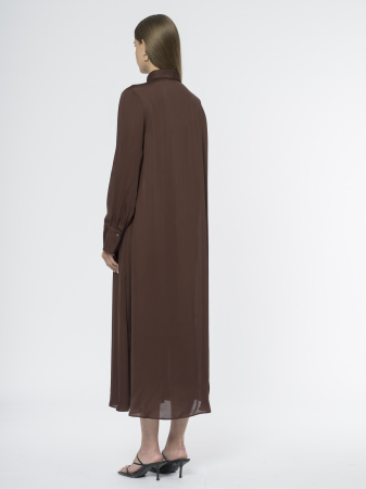 Струящееся платье с отложным воротником – идеальный вариант для создания женственного образа. Сшито из лёгкой вискозы приятного коричневого оттенка, которая мягко струится и комфортна в носке.
