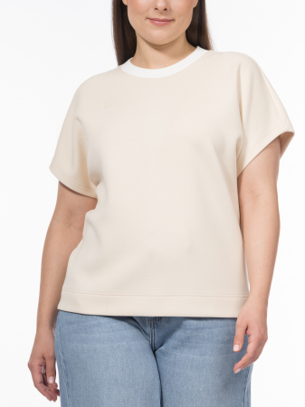 Блуза-свитшот в стиле кэжуал с брендированным декором и подвязами — это сочетание комфорта, стиля и функциональности. Продуманные детали делают модель универсальной для повседневной носки. Блуза выполнена из ткани на основе вискозы с добавлением полиэстера и спандекса. Вискоза делает топ воздухопроницаемым, что особенно комфортно в теплое время года, а нейлон добавляет износостойкость и долговечность, сохраняя форму изделия. Спандекс придает ткани эластичность, обеспечивая хорошую посадку по фигуре и свободу движений. Сочетание этих материалов делает блузу легкой, удобной и приятной к телу, что особенно важно для повседневной носки. Молочный оттенок блузы актуален для теплого весенне-летнего сезона. Прямой силуэт футболки подчеркивает естественные линии фигуры. Цельнокроеные рукава упрощают конструкцию, улучшая посадку по груди, а небольшие разрезы по низу боковых швов добавляют элемент дизайна и обеспечивают дополнительную свободу движений. Круглый вырез с подвязом, выполненным из качественной пряжи на основе вискозы на машине Shima Seiki, обеспечивает дополнительный комфорт и демонстрирует возможности полного цикла собственного производства. Модель декорирована брендированным принтом, нанесенным на собственном производстве с помощью машины для печати по ткани, что добавляет индивидуальности и завершает образ. Блуза-свитшот сочетает в себе современный дизайн и удобство для повседневной носки.