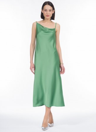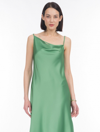 Платье-комбинация или sleep dress - must have гардероба любого сезона. Наши дизайнеры создали модель длины ниже колен с асимметричным вырезом "качели" и тонкой перемычкой между регулируемыми бретелями, повторяющей направление, по которому ниспадают складки горловины. Для того, чтобы уравновесить асимметрию, на спинке выполнен лаконичный прямой вырез. Платье выполнено из высокотехнологичного полиэстера, волокна прочного, износостойкого. Спандекс в составе способствует формоустойчивости изделия. Плотная атласная ткань демонстрирует нюансные переливы света и цвета, а потому эффектно драпируется. Платье в ярком оттенке "зеленый шиповник" хорошо дополнит гардероб и будет востребовано как вечернее, нарядное, новогоднее. Если добавить в образ короткий жакет, пиджак, кардиган, свитер - можно отправиться в офис или на прогулку.