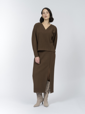 Насыщенный оттенок «шоколадный мартини» выглядит благородно и сочетается с блузой BL1697K, лонгсливами и джемперами коллекции.