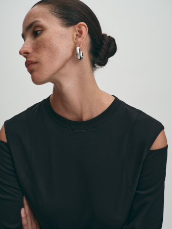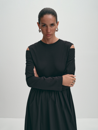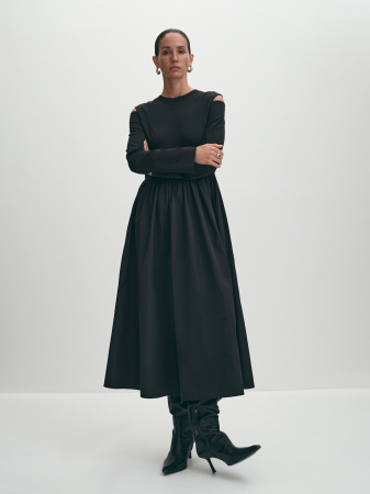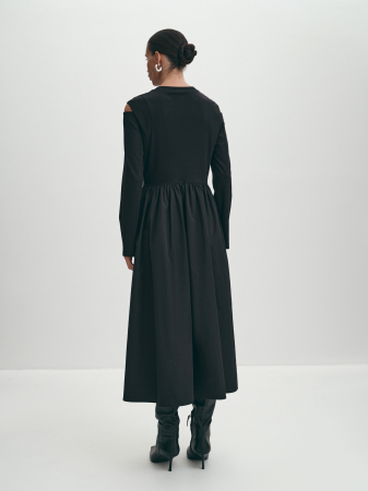Платье отрезное по талии, аналог комплектации лонгслива с юбкой миди. Верх из мягкого хлопкового трикотажа с круглым вырезом и разрезами на плечах дополнен юбкой из гладкой плащевой ткани с расклешением. Талия подчеркнута дизайнерским ремнем. Платье в классическом черном будет востребовано как нарядное, праздничное, вечернее, офисное, деловое.