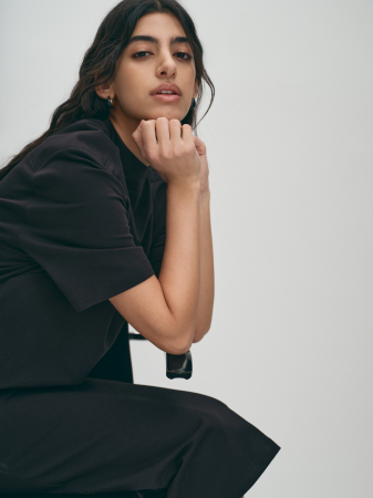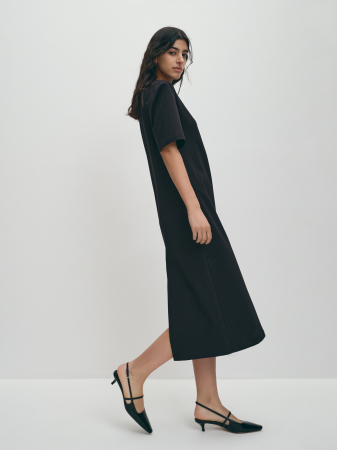 Трудно переоценить комфорт платья-футболки - трикотажное платье длины миди с аккуратным круглым вырезом, коротким рукавом и высокой шлицей, обеспечивающей комфортный шаг, станет палочкой-выручалочкой в Вашем гардеробе. Если подобрать размер на один-два больше обычного, можно сформировать модный силуэт оверсайз, он предполагает ношение вещей большого размена, это удобно и стильно. Хлопковый трикотаж с добавлением спандекса тактильно приятен и хорошо держит форму. Базовый черный визуально вытягивает силуэт и позволяет экспериментировать с акцентными аксессуарами. Платье подходит для офиса, прогулки, встречи с друзьями.