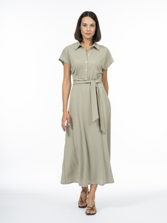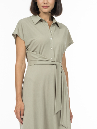 Платье, наполненное природной гармонией, в плане кроя являет собой сочетание классики и современных решений. Отложной воротник на отрезной стойке дисциплинирует и добавляет ноту элегантности, в то время как завышенная талия создает женственный силуэт, мягко подчеркивая фигуру. Асимметричный втачной пояс привносит интересную художественную неровность, делая образ оригинальным, ведь асимметрия, удачно смещая зрительный акцент, всегда подчеркивает достоинства. Помимо видимых элементов кроя, имеют значение неочевидные - скрытая резинка на спине обеспечивает идеальную посадку, способствуя комфорту без ущерба для стиля. Сочетание модифицированной вискозы, лиоцелла и нейлона позволило выбрать для модели ткань привлекательно драпирующуюся, легкую, с визуально интересным эффектом крэш. Дышащая легкая вискоза прекрасно сочетается с мягким и шелковистым лиоцеллом и дополняется практичным нейлоном, прочным и ответственным за сохранность крэш-эффекта. Сложный цвет, сочетающий в себе природную нейтральность и современную элегантность, прекрасно оттеняет переливы инновационной смешанной ткани. Это приглушенный серо-зеленый оттенок с легким оливковым подтоном, напоминающий цвет высушенных чайных листьев. Такое платье можно адаптировать как в стиль гранж, дополнив курткой и грубыми ботинками, так и в вечерний look, если совместить его с его изящными аксессуарами.