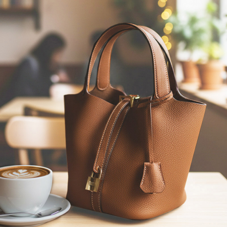 Удобные короткие ручки, центральный ремешок с декоративным замком, аккуратная строчка.