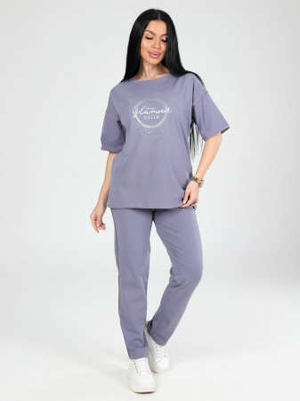 Костюм женский состоит из футболки и брюк. Футболка прямого силуэта со спущенной линией плеча. По шву втачивания рукава-кант из отделочной ткани. По центру полочки принт. Брюки с карманами и отделочным кантом в боковых швах.