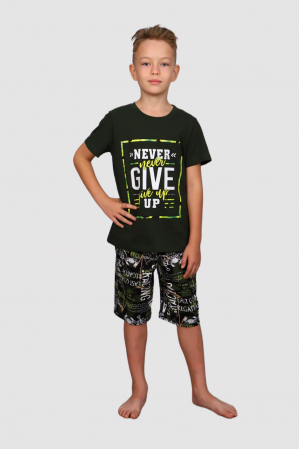 Пижама для мальчика из хлопкового полотна. Однотонная футболка с втачным рукавом декорирована крупным ярким принтом. Удлиненные шорты на поясе резинке выполнены из ткани пестрой расцветки. Пижама удобна и практичена в носке. Детали комплекта также могут носиться по отдельности, будучи дополненными другими элементами гардероба. Отличный вариант для дома, прогулок и активного отдыха.
