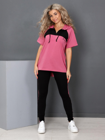 Футболка прямого силуэта, свободного кроя, длиной выше уровня бедер. Леггинсы выполнены из растяжимого материала, вдоль боковых швов расположен лампас в тон футболки. Костюм прекрасно подойдет для дома и отдыха.