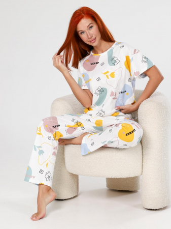 Пижама "Мирин" из набивного трикотажного полотна "кулирка" состоит из футболки и брюк. Футболка свободного покроя со спущенной линией плеча, короткими втачными рукавами, горловиной овальной формы, обработанной втачной планкой. Брюки длинные, свободного покроя, на притачном поясе с эластичной лентой и карманами в боковых швах.