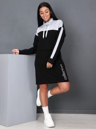 Платье женское прямого силуэта в спортивном стиле. Воротник-стойка регулируется шнуром. На полочке отделочная планка и карман "кенгуру". По боковому шву-печать. Длинный рукав с лампасами на манжете.