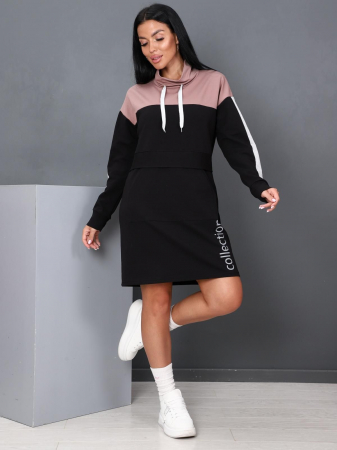 Платье женское прямого силуэта в спортивном стиле. Воротник-стойка регулируется шнуром. На полочке отделочная планка и карман "кенгуру". По боковому шву-печать. Длинный рукав с лампасами на манжете.