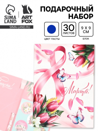 Подарочный набор, блок бумаги 30 л., ручка синяя паста 1.0 мм, наклейки 5 шт. «С 8 Марта. Открытка» (арт. 10902184)